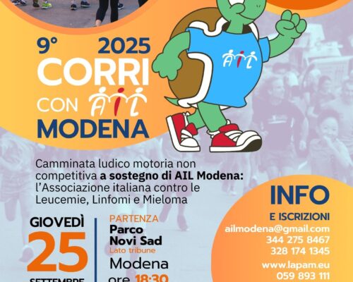 Si è disputata mercoledì 2 ottobre l’8° edizione della Corri con AIL Modena, purtroppo quet’anno il tempo non e’ stato clemente e abbiamo dovuto rimandare la datra prevista. Ringraziamo tutti coloro che, nonostante le condizioni meteo avverse, non hanno voluto mancare anche quest’anno ! Ringraziamo anche i fantastici volonari di AIL Modena , sempre disponibili ed entusiasti, al prossimo anno!!!! ...