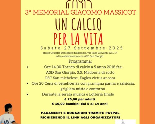 Gli amici di Giacomo vi aspettano sabato 27 Settembre presso l’Oratorio Don Bosco di Sassuolo per il 3° Memorial in suo ricordo ! Potete prenotare per la cena ai numeri 345/0813183 Leo – 347/1882809 Lucio – 393/4459208 Nico ed il pomeriggio assistere al torneo di calcio…e fare il tifo….. Tutto il ricavato della serata andrà alla nostra Associazione, per donare una speranza...